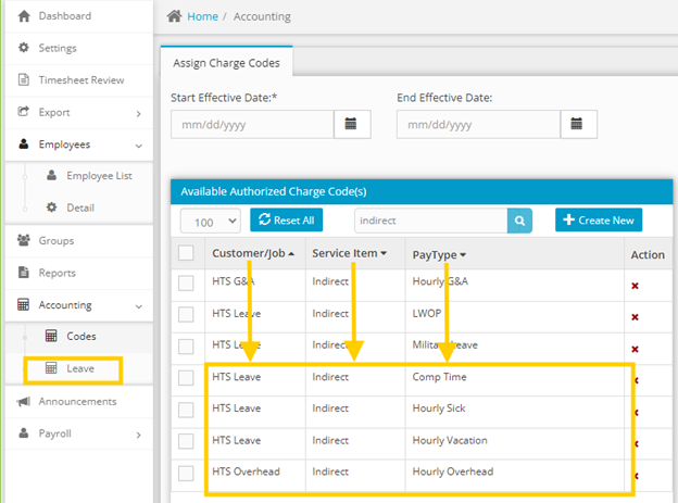 Step 3. Navigate to the Accounting/Codes page and assign the charge code to the employee that includes the full mapping of the Customer/Job <-> Service Item <-> Leave Pay Type.